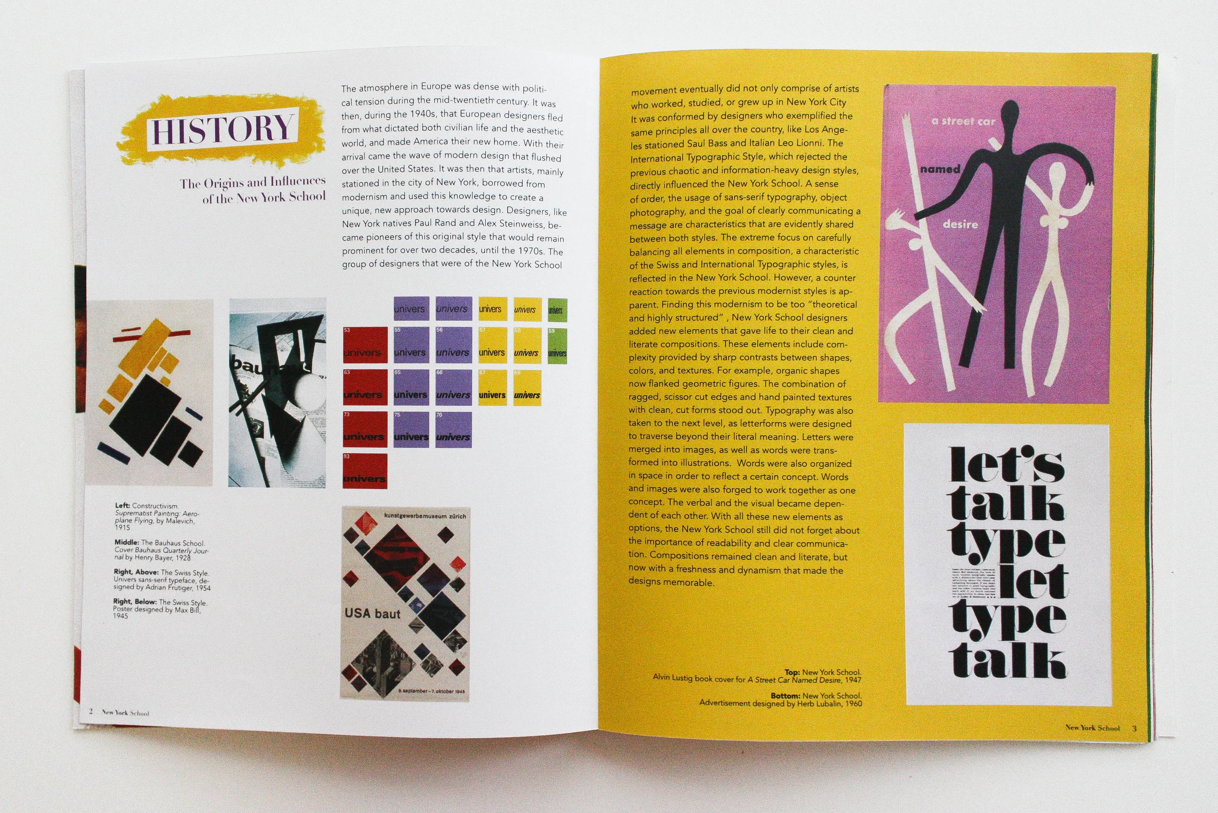 The New York School was a modern movement that took the formally established structure of European design and fused it with the youthful concepts of American design. It was in the 1940s that New York, with its diverse, artistic climate, became the birthplace of this influential style of design. By combining old and new methods, New York School designers concurrently solved communication problems and participated in ideological expression without dismissing the elements of vitality and unexpectedness that were introduced by the movement